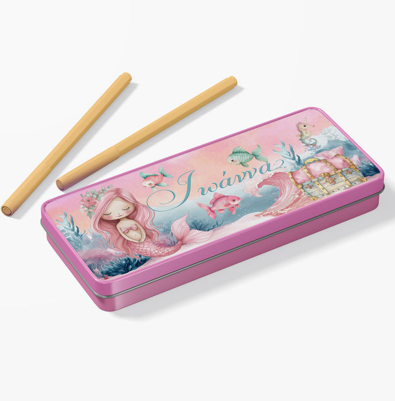 Μεταλλική ροζ κασετίνα με σχέδιο Γοργόνα και τυπωμένο το όνομα! Βάλε σ'αυτή τα αγαπημένα σου σχολικά αντικείμενα ή δώρισέ την σε μια φίλη σου και ξεχωρίστε στην τάξη!