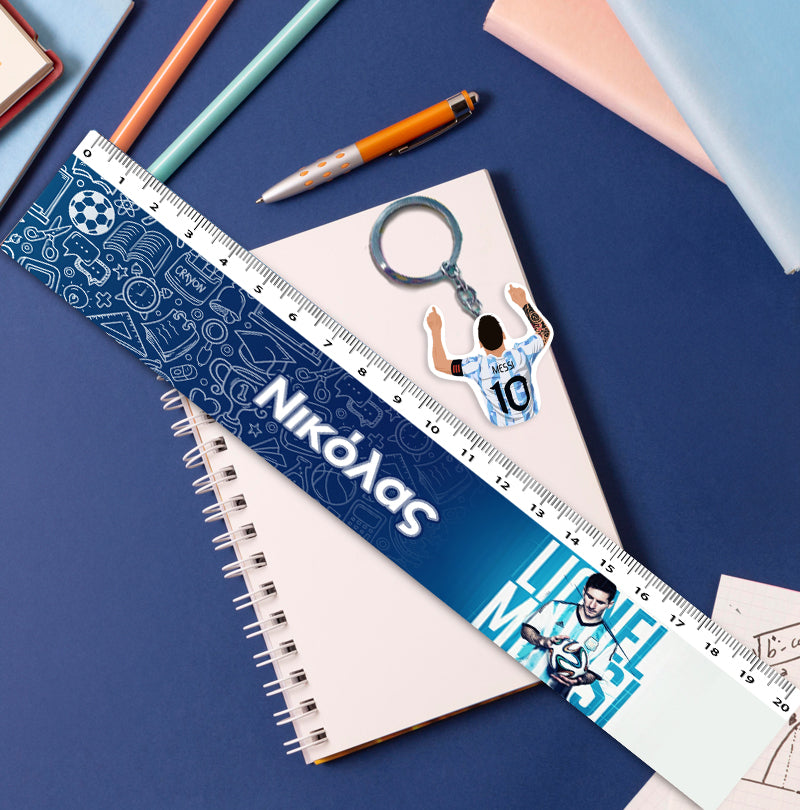 Προσωποποιημένος χάρακας Messi με το όνομα και ασορτί μπρελόκ! To πιο τέλειο αξεσουάρ για το σχολείο ή το φροντιστήριο!