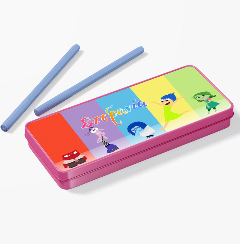 Μεταλλική ροζ κασετίνα με σχέδιο Inside Out και τυπωμένο το όνομα! Βάλε σ'αυτή τα αγαπημένα σου σχολικά αντικείμενα ή δώρισέ την σε μια φίλη σου και ξεχωρίστε στην τάξη!