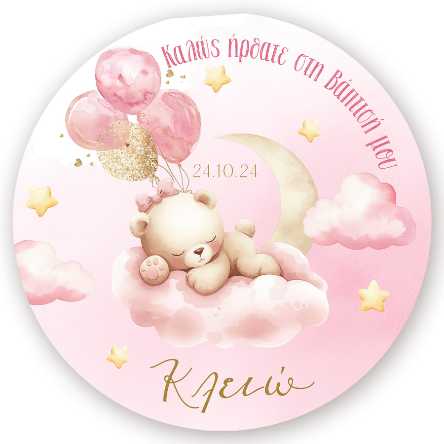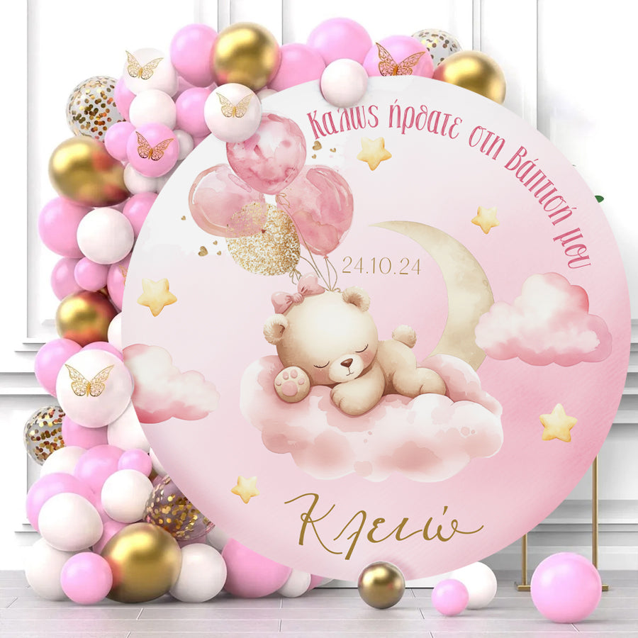 Στρογγυλή αφίσα με θέμα Αρκουδάκι σε ροζ αποχρώσεις και εκτυπωμένο το μήνυμα που θέλετε, για να διακοσμήσετε το χώρο της βάπτισης του μωρού σας!