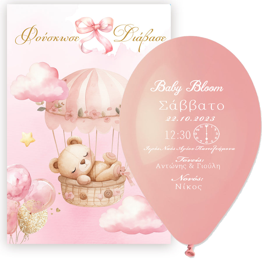 Πρωτότυπο προσκλητήριο βάπτισης σε τυπωμένο μπαλόνι με θέμα Αρκουδάκι. Οι καλεσμένοι θα πρέπει να φουσκώσουν το τυπωμένο μπαλόνι για να μάθουν τις λεπτομέρειες της βάπτισης!
