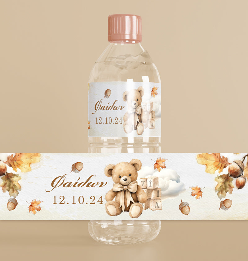 Διακοσμήστε τα μπουκαλάκια νερού με ετικέτες σε θέμα Φθινοπωρινή Βάπτιση Αρκουδάκι, που μπορούν να αναγράφουν το όνομα του παιδιού.
