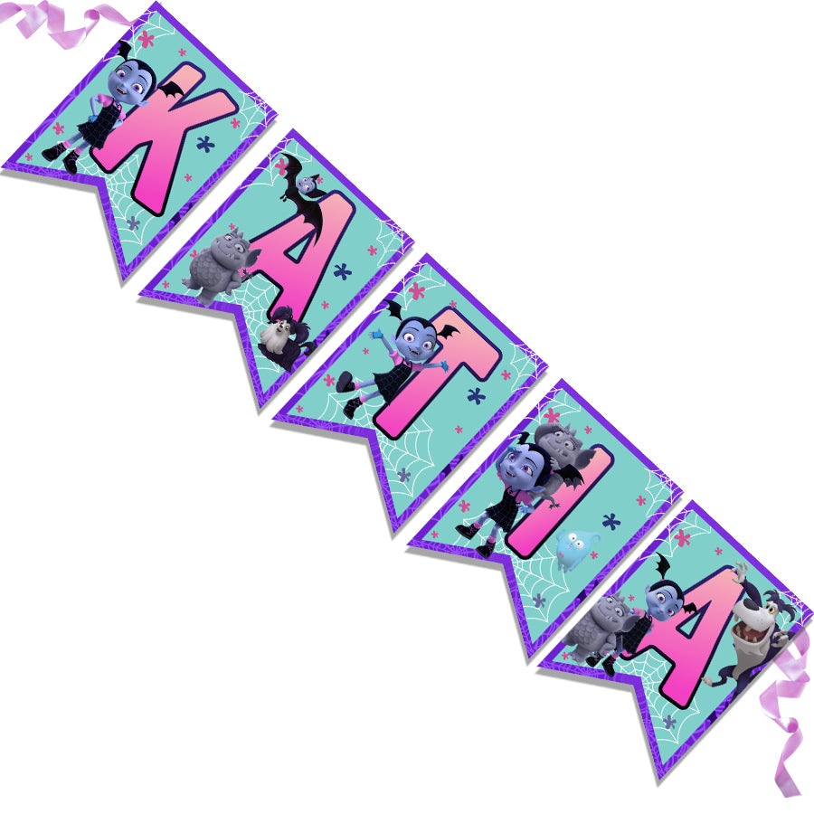 Διακοσμητικά σημαιάκια με θέμα Βαμπιρίνα και το όνομα της επιλογής σας τυπωμένο επάνω για να στολίσετε μοναδικά τον χώρο του πάρτυ!