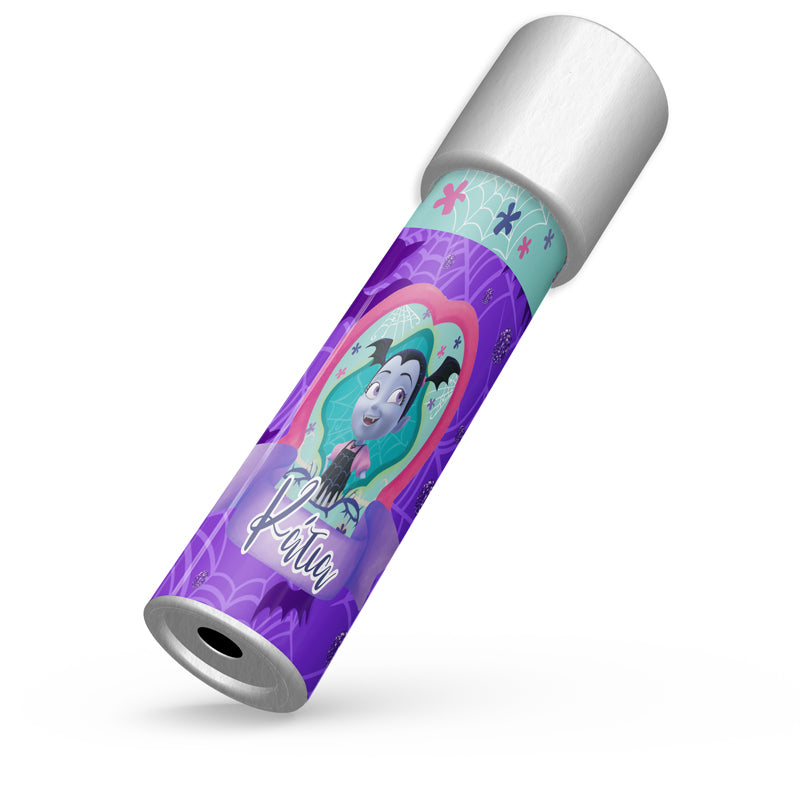 Καλειδοσκόπιο με θέμα Βαμπιρίνα, που το περιστρέφεις και αποκαλύπτονται αμέτρητα σχέδια! Ιδανικό για δώρο στους μικρούς καλεσμένους του πάρτυ, που θα τους μαγνητίσει και θα τους οδηγήσει σε ένα ατελείωτο παιχνίδι με τις αντανακλάσεις του φωτός.