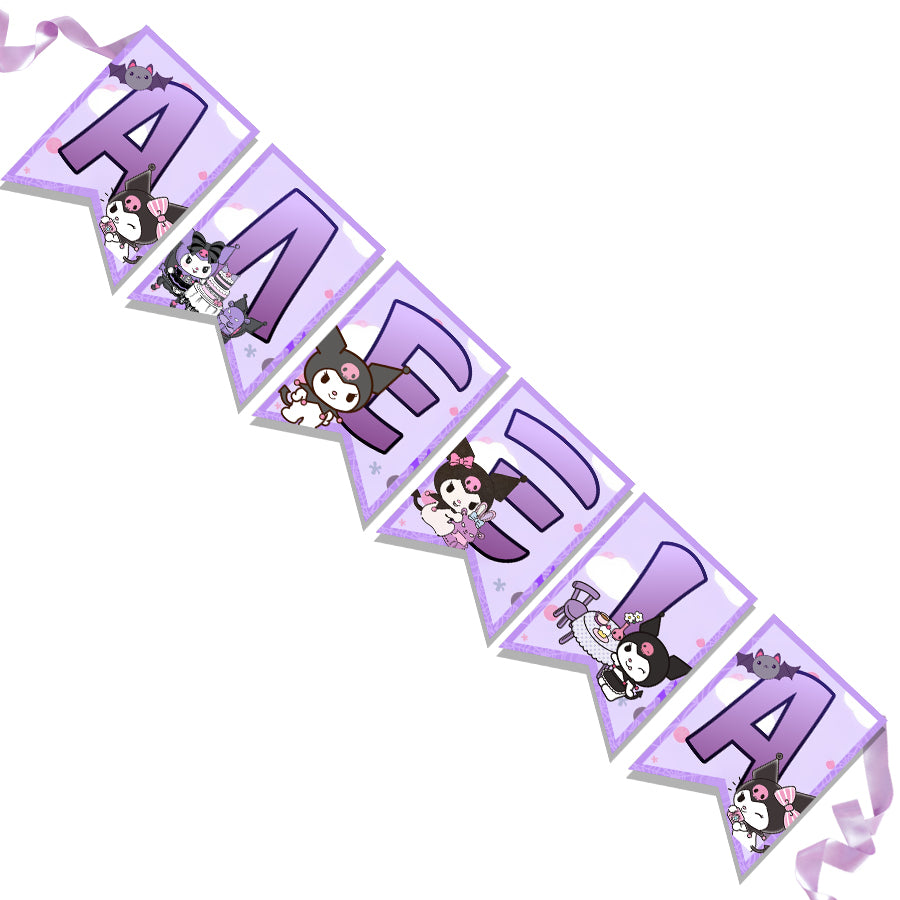 Διακοσμητικά σημαιάκια με θέμα Kuromi και το όνομα της επιλογής σας τυπωμένο επάνω για να στολίσετε μοναδικά τον χώρο του πάρτυ!