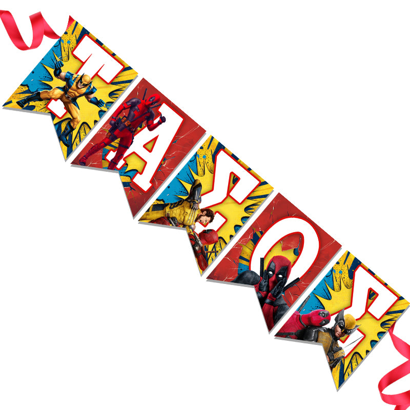 Διακοσμητικά σημαιάκια με θέμα Deadpool & Wolverine και το όνομα της επιλογής σας τυπωμένο επάνω για να στολίσετε μοναδικά τον χώρο του πάρτυ!