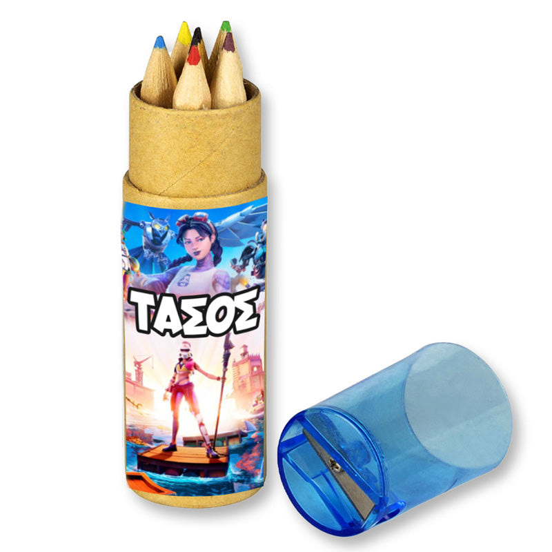 Προσωποποιημένες ξυλομπογιές σε κραφτ κουτάκι με θέμα Fortnite 2, για να χαρίσετε στους καλεσμένους του πάρτυ.