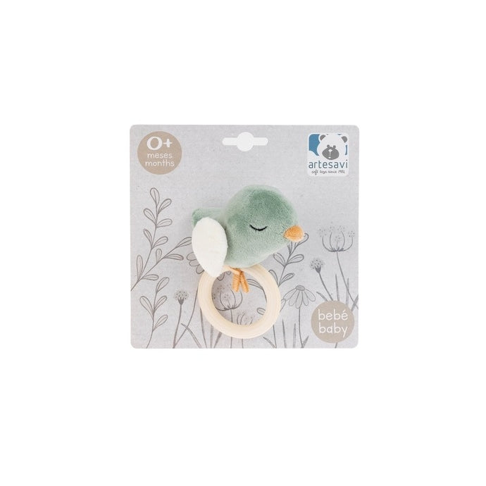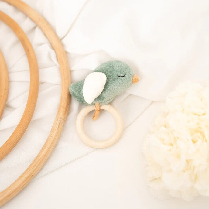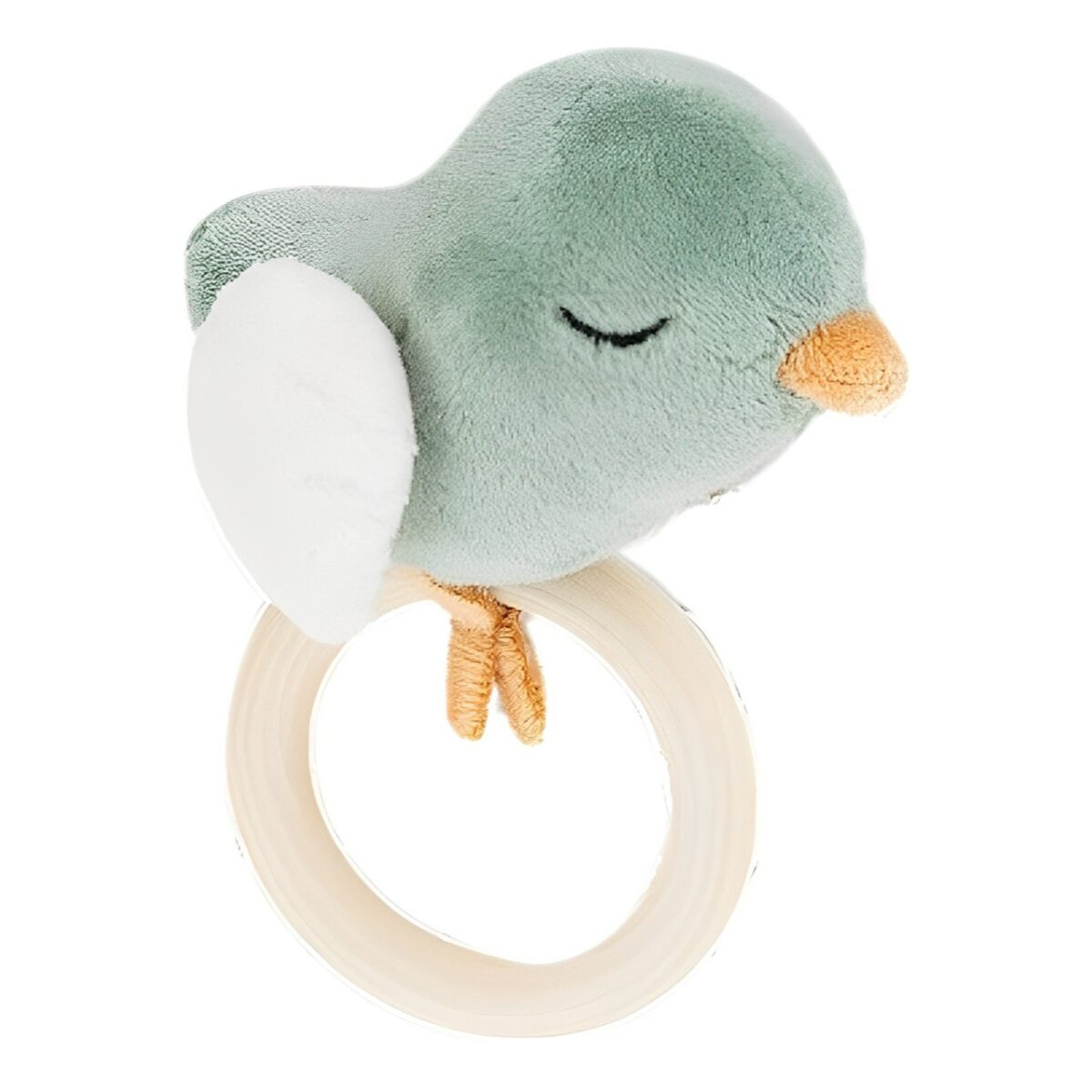 Απαλή κουδουνίστρα με χαριτωμένο σχέδιο παπαγαλάκι και ξύλινη λαβή, ιδανική για βρέφη. Ελαφριά και εύκολη στο κράτημα, διασκεδάζει και διεγείρει την περιέργεια του μωρού με απαλούς ήχους κουδουνίσματος.
