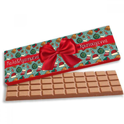 Γίγας σοκολάτα σε χάρτινη κασετίνα με σχέδιο δώρο και μεγάλο κόκκινο φιόγκο, για να γλυκάνετε κάποιο αγαπημένο σας πρόσωπο την περίοδο των Χριστουγέννων!