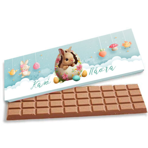 Γίγας σοκολάτα σε χάρτινη κασετίνα με λαγουδάκι και μήνυμα "Καλό Πάσχα". Χαρίστε τη στα αγαπημένα σας πρόσωπα και ευχηθείτε Καλό Πάσχα με το πιο γλυκό τρόπο!