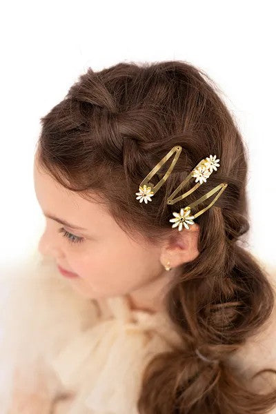 Μεταλλικά κλιπ μαλλιών Μαργαρίτα σε χρυσό χρώμα με λευκά στοιχεία. Το σετ περιέχει 3 τεμάχια με κλιπ μαλλιών