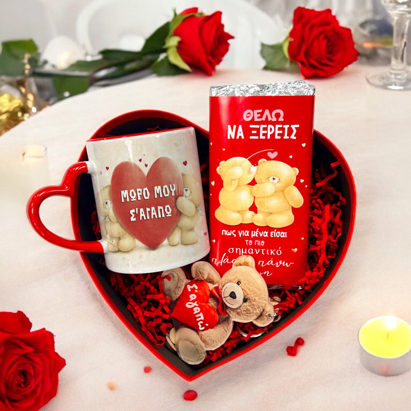 Κουτί Καρδιά με δωράκια για να χαρίσεις στο ταίρι σου για τον Άγιο Βαλεντίνο ή την επέτειο σας και να εντυπωσιάσεις!Οι διαστάσεις του κουτιού είναι 21,5 x 20 x 9 cm και περιλαμβάνει: