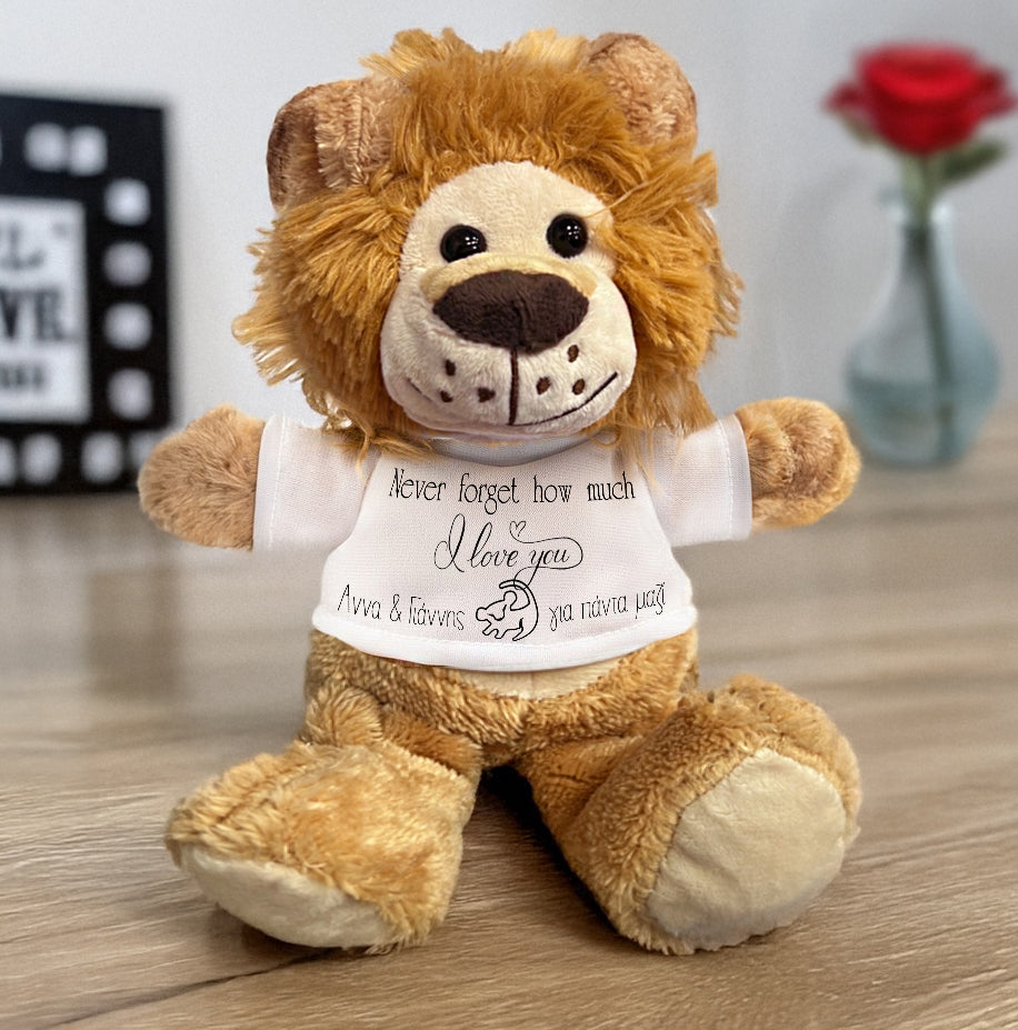 Λούτρινο λιονταράκι με λευκό T-Shirt τυπωμένο με το μήνυμα της επιλογής σου, για να χαρίσεις στο άτομο που αγαπάς ως δώρο για τον Άγιο Βαλεντίνο ή την επέτειο σας και να το κάνει πολλές αγκαλιές!