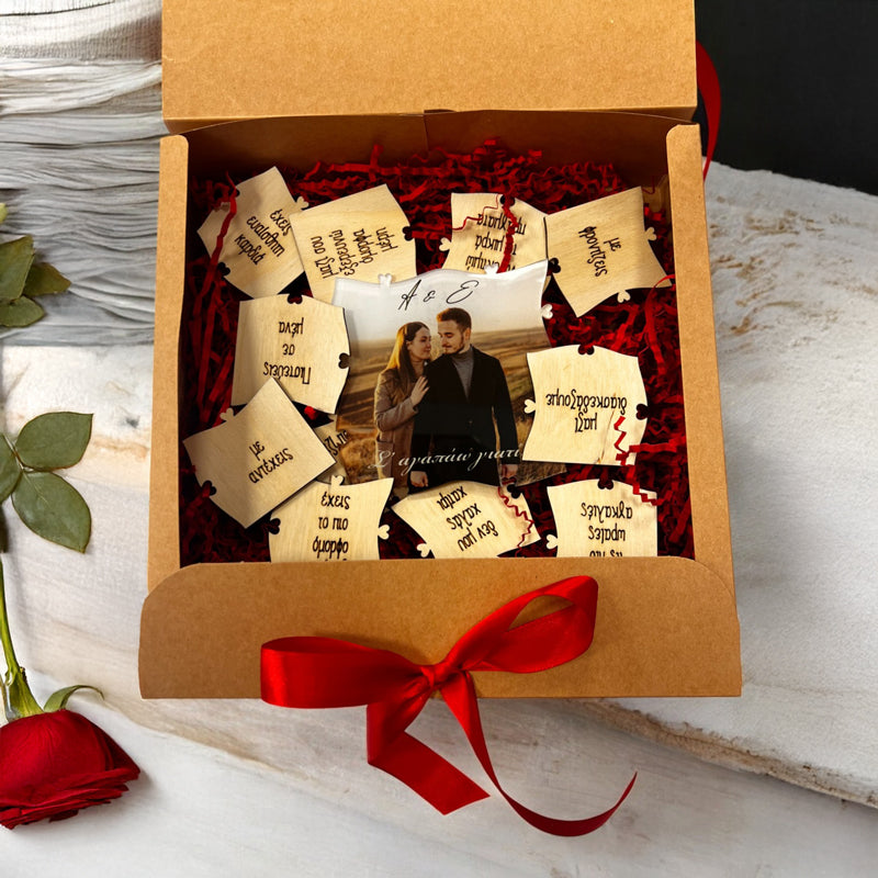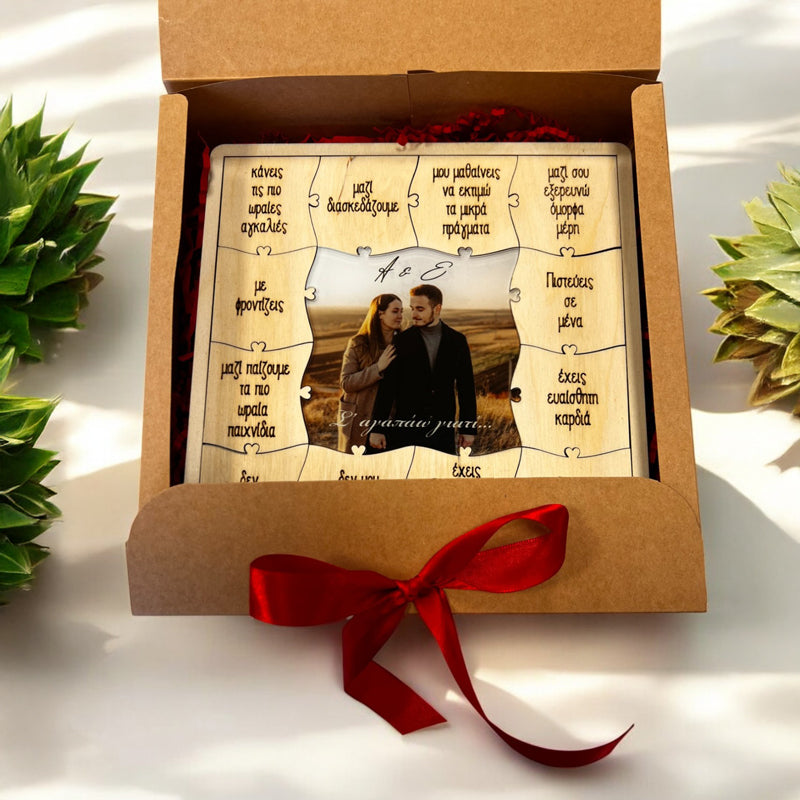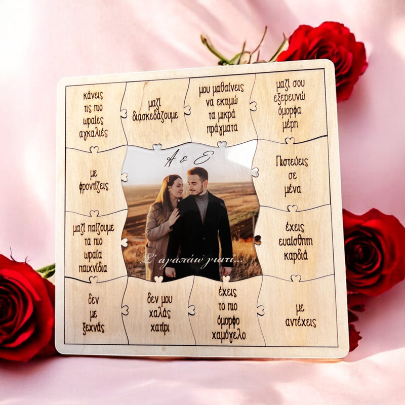 Ξύλινο παζλ-κάδρο με χαραγμένους τους λόγους που αγαπάτε το ταίρι σας και τη δική σας φωτογραφία τυπωμένη σε plexiglass στο κέντρο του παζλ! Ένα μοναδικό, προσωποποιημένο δώρο που εκφράζει την αγάπη σας με ξεχωριστό τρόπο.