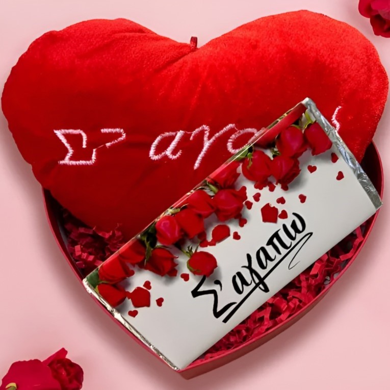 Δείξε στο ταίρι σου την αγάπη σου με αυτό το γλυκό δώρο! Κουτί καρδιά που περιέχει ένα λούτρινο διακοσμητικό σε σχήμα καρδιάς και μια σοκολάτα με μήνυμα Σ' αγαπώ.