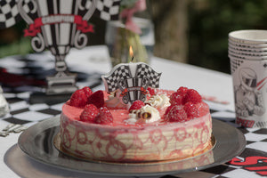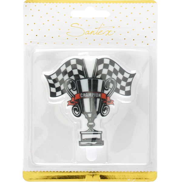 Κεράκι τούρτας με τρόπαιο και καρό σημαίες και θέμα Formula 1, ιδανικό για μικρούς πρωταθλητές και θεματικά πάρτι αγώνων!