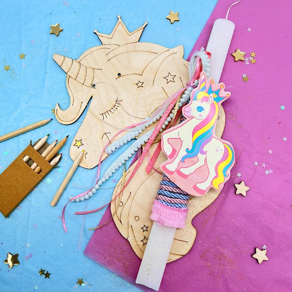 - H λαμπάδα φέρει ξύλινο διακοσμητικό Μονόκερο με υψηλής ποιότητας εκτύπωση και κορδέλες σε ταιριαστές αποχρώσεις