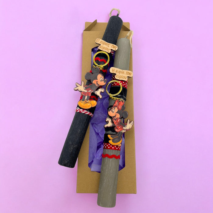 Σετ Λαμπάδες Mickey & Minnie για Ζευγάρι από αρωματικά κεριά διακοσμημένα με κορδέλες. Θα κρατήσετε τα μπρελόκ για ενθύμιο και θα είστε ασορτί!