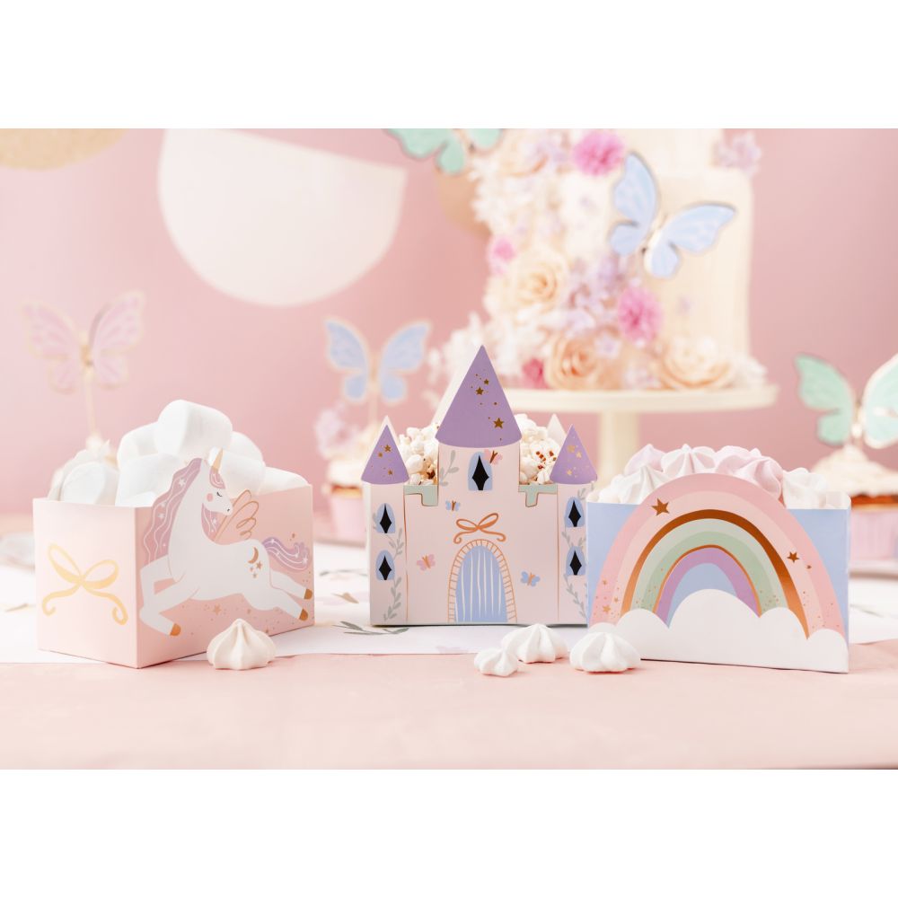 Χάρτινα κουτάκια για κεράσματα σε 3 διαφορετικά σχέδια: Μονόκερο, Ουράνιο τόξο & Κάστρο για να στήσετε το πιο παραμυθένιο τραπέζι στο πιο γλυκό θεματικό παιδικό πάρτυ!
