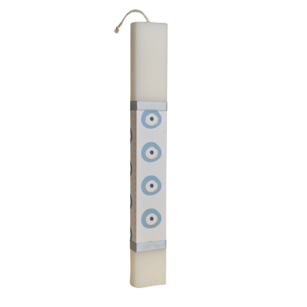Πασχαλινή Λαμπάδα πλακέ σε λευκό χρώμα,διακοσμημένη με γαλάζια ματάκια και 2 κορδέλες στο ίδιο χρώμα πάνω και κάτω από το διακοσμητικό σχέδιο!