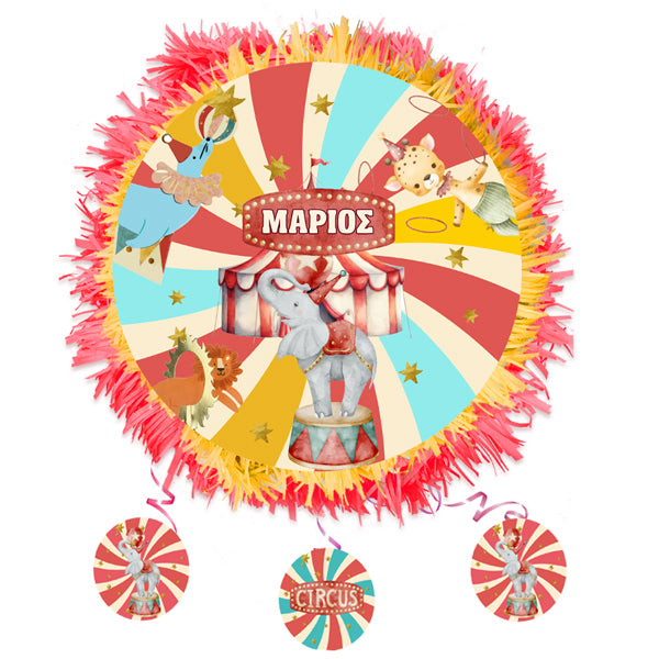 Από την πινιάτα κρέμονται 3 στρογγυλά διακοσμητικά από χαρτόνι με τύπωμα στο θέμα της πινιάτας