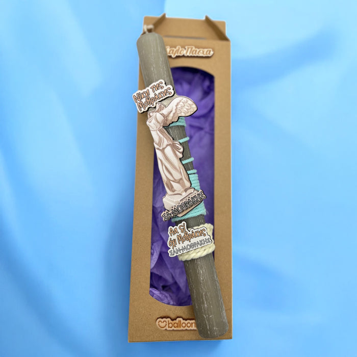 Πασχαλινή Αρωματική Λαμπάδα Νίκη της Μοθράκης χιουμοριστική, από την σειρά Σαββατογεννημένες με υπέροχα υλικά και κορδέλες, που θα κλέψει τις εντυπώσεις και θα μοιράσει χαμόγελα!