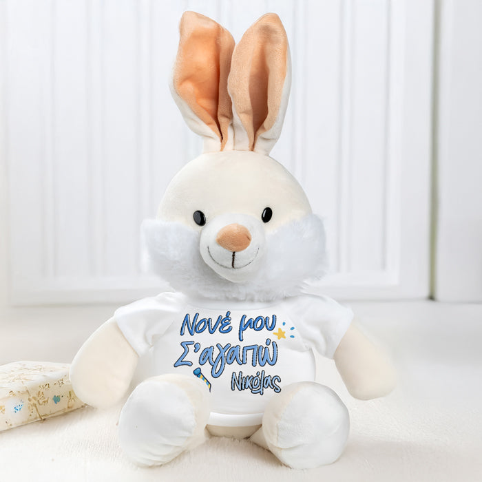 Λούτρινο λαγουδάκι με λευκό T-Shirt τυπωμένο με το μήνυμα της επιλογής σου, για να χαρίσεις στο νονό σου για το Πάσχα και να του δείξεις πόσο σημαντικός είναι για σένα!
