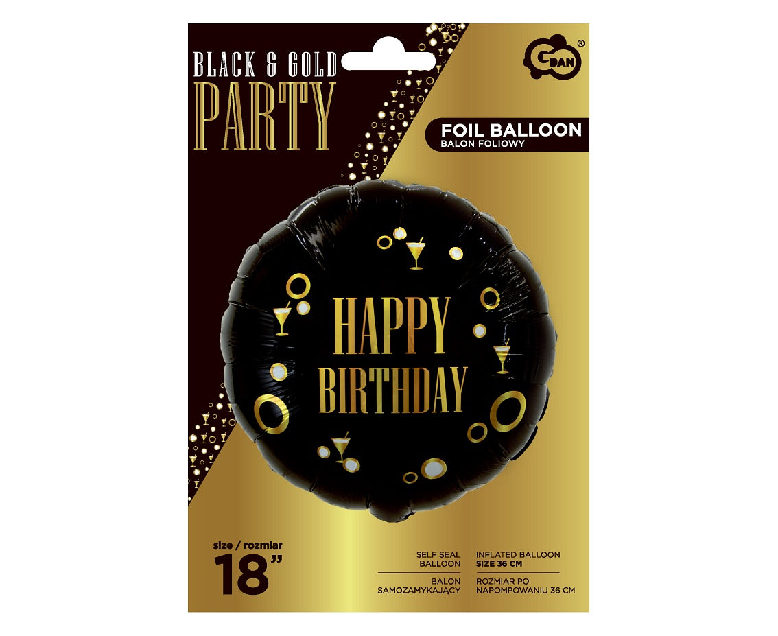 Εντυπωσιακό στρογγυλό μαύρο μπαλόνι γενεθλίων με χρυσά στοιχεία πάρτυ και μήνυμα ”Happy Birthday”! Μια όμορφη ιδέα για διακόσμηση πάρτυ ή για δώρο στον εορτάζοντα!