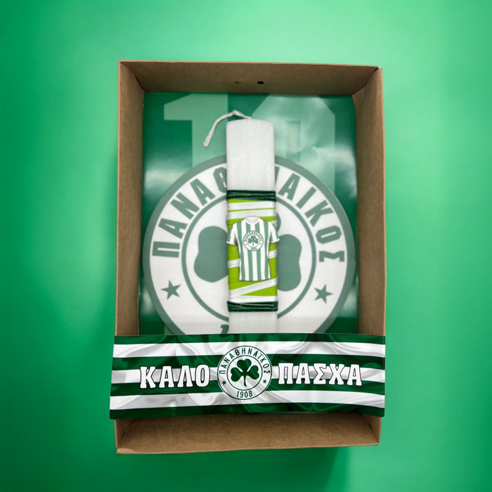 Πασχαλινή Λαμπάδα Παναθηναϊκός μαζί με ξύλινο κάδρο για το δωμάτιο, για τα πιο ποδοσφαιρόφιλα βαφτιστήρια!