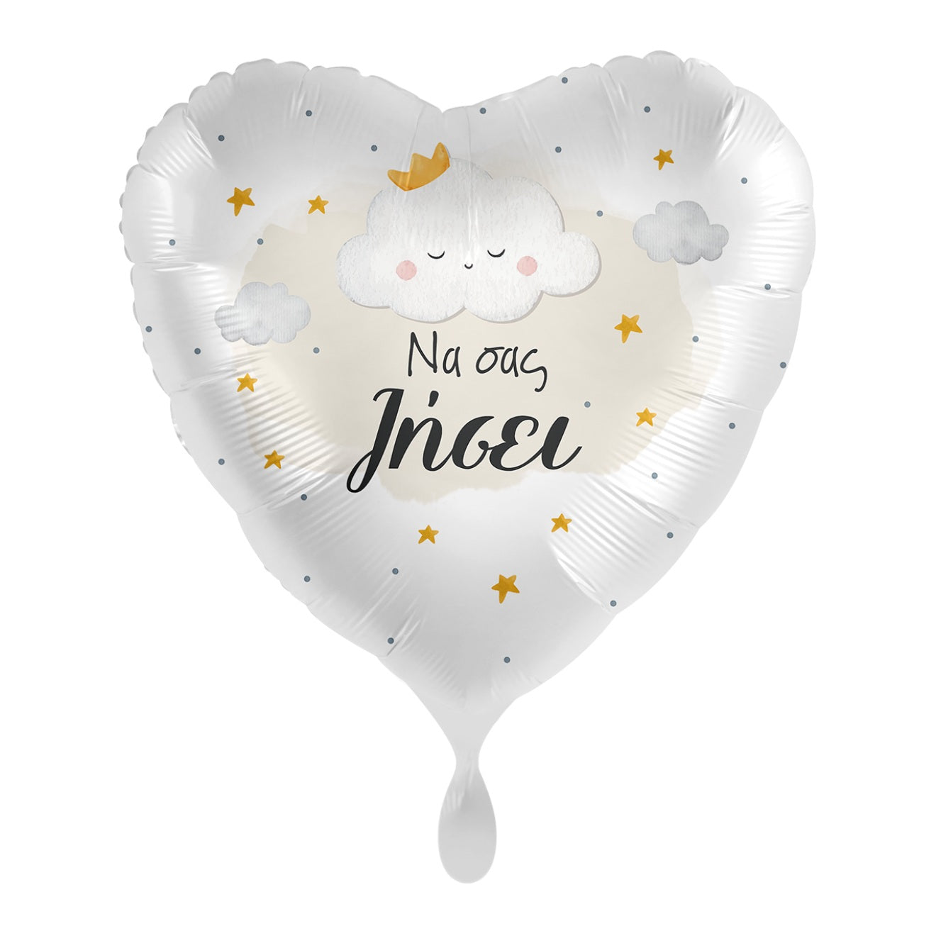 Μπαλόνι σε σχήμα καρδιάς με μήνυμα “Να σας ζήσει” διακοσμημένο με συννεφάκια και αστεράκια. Ιδανικό για τον στολισμό του τραπεζιού της βάπτισης ή για το baby shower!