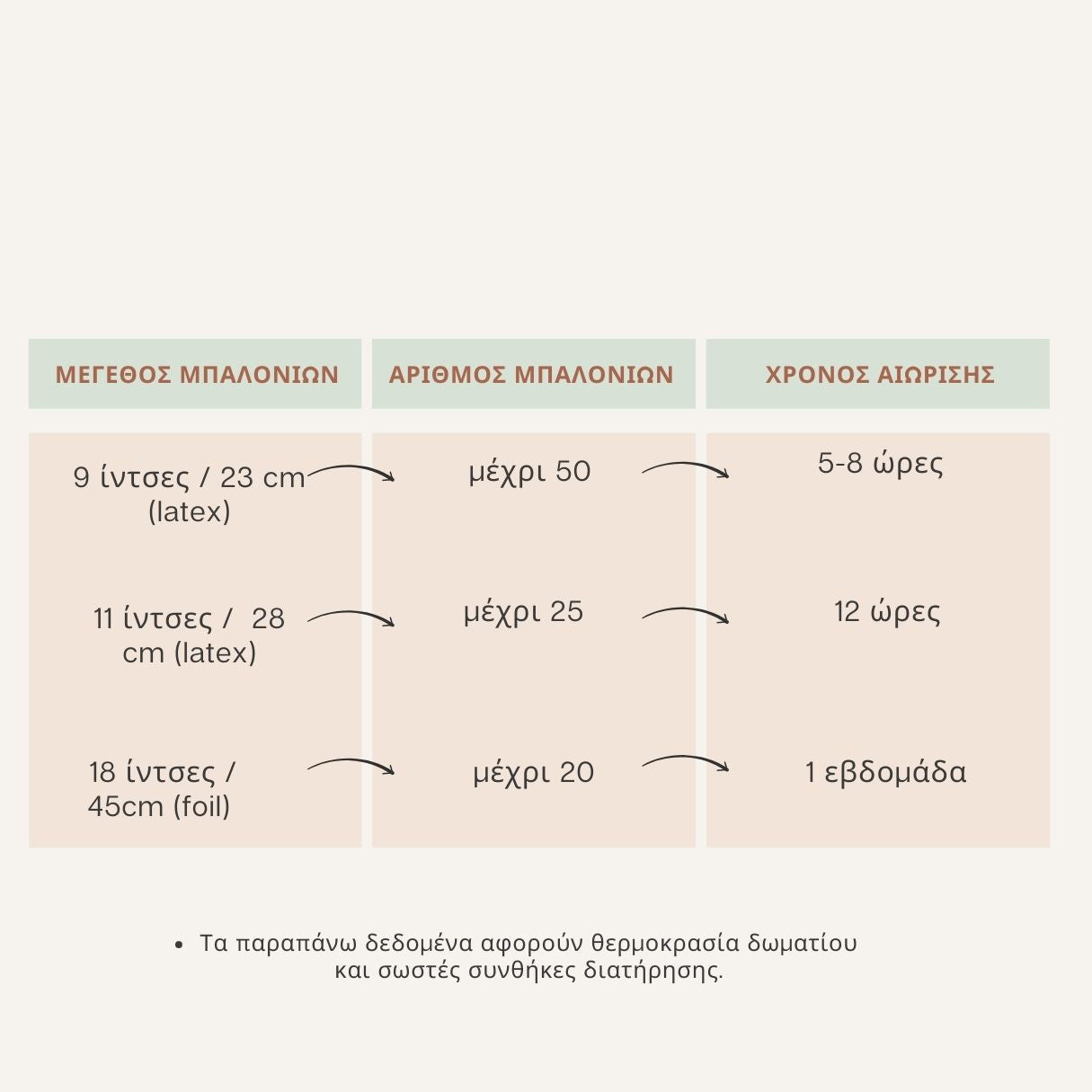- Για καλύτερο αποτέλεσμα, θα πρέπει τα μπαλόνια να φουσκωθούν 1-2 ώρες πριν την εκδήλωση και όχι πολλές ώρες πριν
