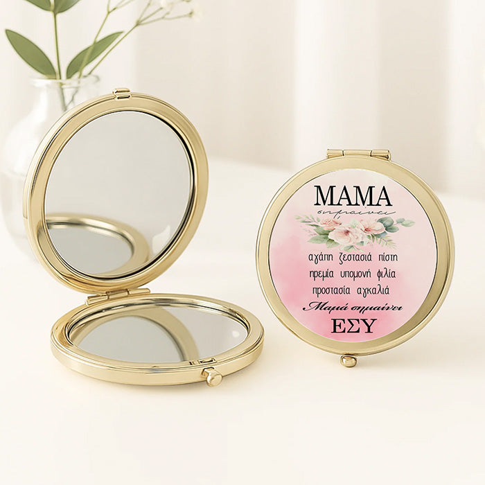 Μεταλλικό καθρεφτάκι στρογγυλό που ανοίγει, σε χρυσό χρώμα και το όνομα της επιλογής σου για να το χαρίσεις ως δώρο στην αγαπημένη σου μαμά!