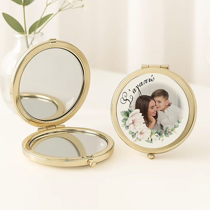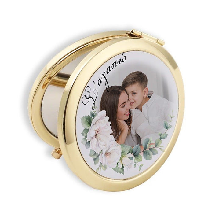 Μεταλλικό καθρεφτάκι στρογγυλό που ανοίγει, σε χρυσό χρώμα και την φωτογραφία της επιλογής σου για να το χαρίσεις ως δώρο στην αγαπημένη σου μαμά!