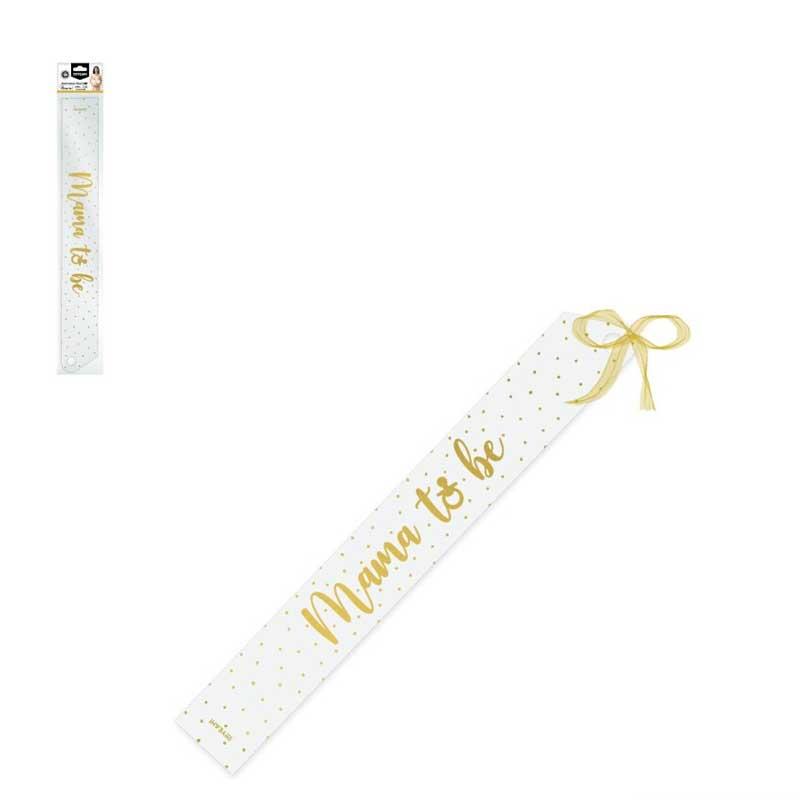 Λευκή κορδέλα με χρυσά γράμματα "Mama To Be", για να φορέσει η μέλλουσα μανούλα στο Baby Shower πάρτυ ή στο Gender Reveal!
