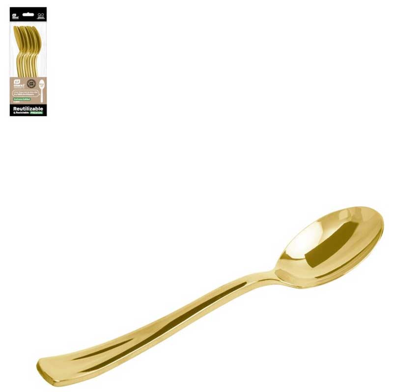 Επαναχρησιμοποιούμενα πλαστικά κουταλάκια σε χρώμα μεταλλικό χρυσό. Μια πρωτότυπη σειρά από επαναχρησιμοποιήσιμα προϊόντα, κατάλληλα για καθημερινή χρήση αλλά και για κάθε εκδήλωση όπως γενέθλια, πάρτι ή άλλες εορταστικές περιστάσεις.
