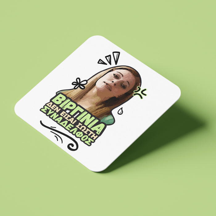 Ξύλινο σουβέρ για να ακουμπάς την κούπα σου, με την πολυαγαπημένη Αμαλία από την ελληνική σειρά στο Παρά 5 με την ατάκα ΒΙΡΓΙΝΙΑ.