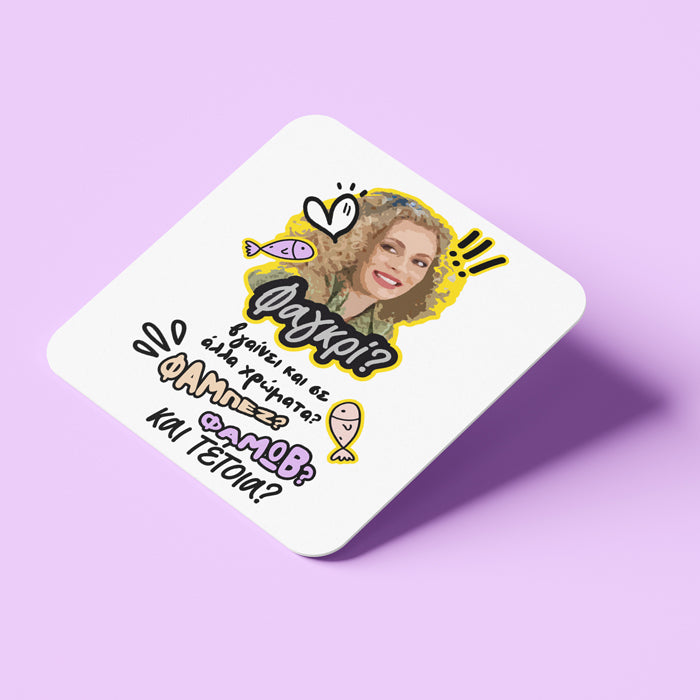 Ξύλινο σουβέρ για να ακουμπάς την κούπα σου, με την πολυαγαπημένη Ντάλια από την ελληνική σειρά στο Παρά 5 με την ατάκα ΦΑΓΚΡΙ ΦΑΜΠΕΖ ΦΑΜΩΒ.