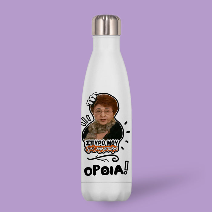 Το τέλειο παγούρι - θερμός με την πολυαγαπημένη Θεοπούλα από την ελληνική σειρά στο Παρά 5 με την ατάκα ΟΡΘΙΑ και να μοιράζεις χαμόγελα. Κατασκευασμένο από ανθεκτικό ανοξείδωτο ατσάλι διπλού τοιχώματος που διατηρεί τη θερμοκρασία, αυτός ο θερμός είναι ιδανικός για να τον μεταφέρεις μαζί σου όπου κι αν πας.