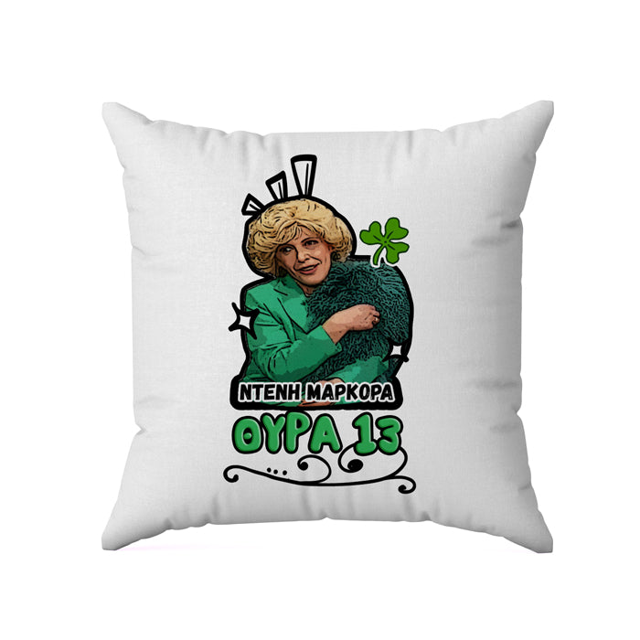 Μαξιλάρι για να διακοσμεί τον χώρο σου, με την πολυαγαπημένη Ντένη Μαρκορά την στιγμή που δηλώνει το όνομα και την θρησκεία της Παο θύρα 13.