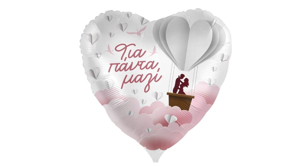 - Έρχεται φουσκωμένο με ήλιον Μπαλόνι σε σχήμα καρδιάς με μήνυμα “Για πάντα μαζί” και σχέδιο ζευγάρι σε αερόστατο, για μια ρομαντική διακόσμηση! Διαστάσεις: 45cm / 18”
