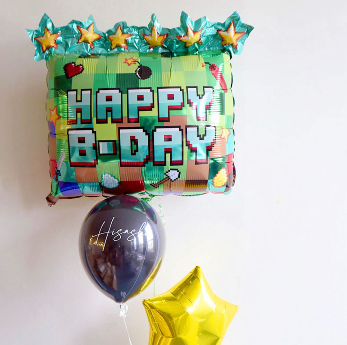Μεγάλο, εντυπωσιακό μπαλόνι με θέμα pixel/gaming. Διαθέτει φωτεινό, πολύχρωμο ψηφιακό grid – ελαφρώς εμπνευσμένο από video games/minecraft – με εκτυπωμένο το μήνυμα “Happy B‑Day”.