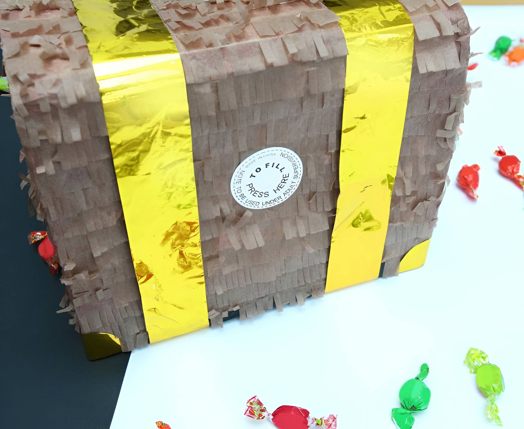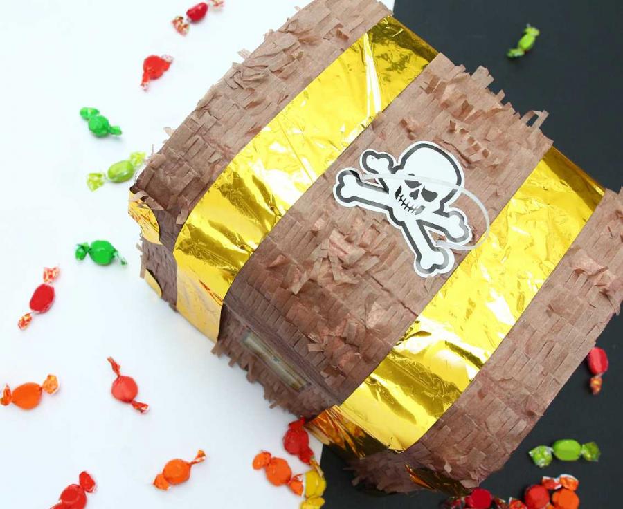 Σχηματική πινιάτα με κορδέλες Σεντούκι Θησαυρού, για το παιχνίδι του πειρατικού πάρτι!