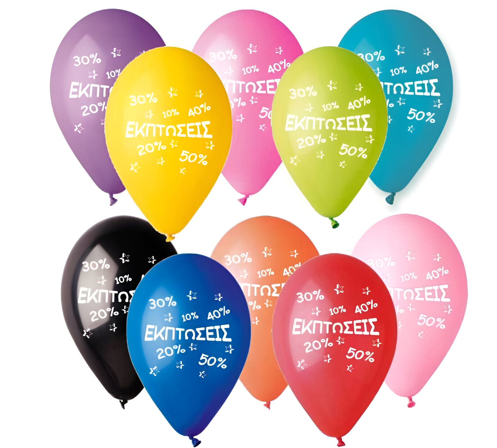 "Πολύχρωμα λάτεξ μπαλόνια με εκτύπωση ""ΕΚΠΤΩΣΕΙΣ"", για να στολίσετε το κατάστημα!