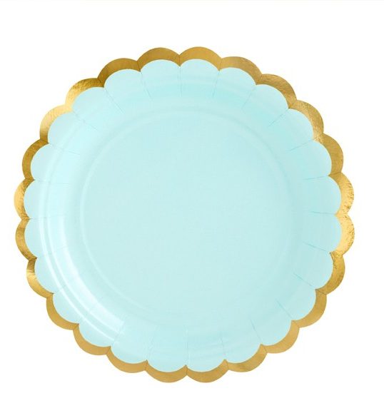 "Πιάτα γλυκού σε χρώμα γαλάζιο της μέντας με χρυσό περίγραμμα, για το τραπέζι του πάρτυ.