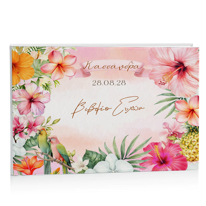 Εντυπωσιακό, χειροποίητο Βιβλίο Ευχών με σχέδιο Tropical Ιβίσκος για τη βάπτιση του μωρού σας! Κρατήστε για πάντα τις ευχές των καλεσμένων σας σε ένα όμορφο ευχολόγιο.
