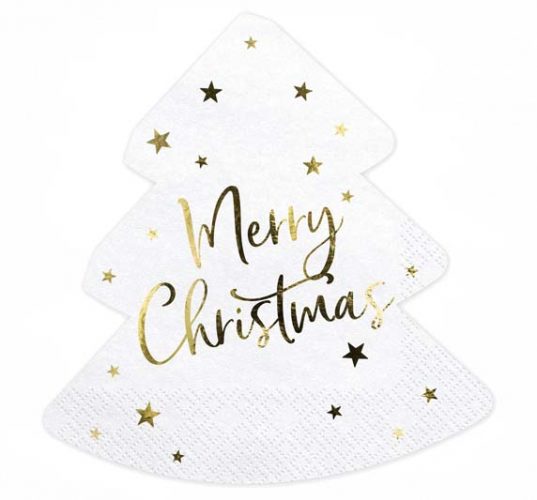 "Λευκές σχηματικές χαρτοπετσέτες με Χριστουγεννιάτικο Δέντρο και χρυσή μεταλλική εκτύπωση Merry Christmas. Κάντε το γιορτινό τραπέζι ακόμα πιο όμορφο!