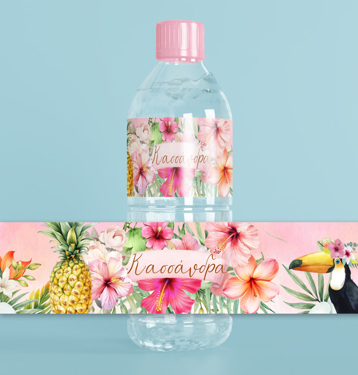 Διακοσμήστε τα μπουκαλάκια νερού με ετικέτες σε θέμα Βάπτιση Tropical Ιβίσκος, που μπορούν να αναγράφουν το όνομα του παιδιού.