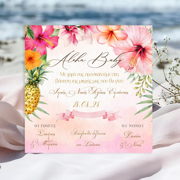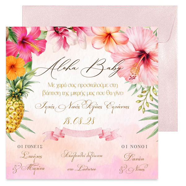 Προσκλητήριο Βάπτισης με θέμα Tropical Ιβίσκος, για να μοιράσετε στους αγαπημένους σας για τη βάπτιση του μικρού σας και να κλέψετε τις εντυπώσεις.