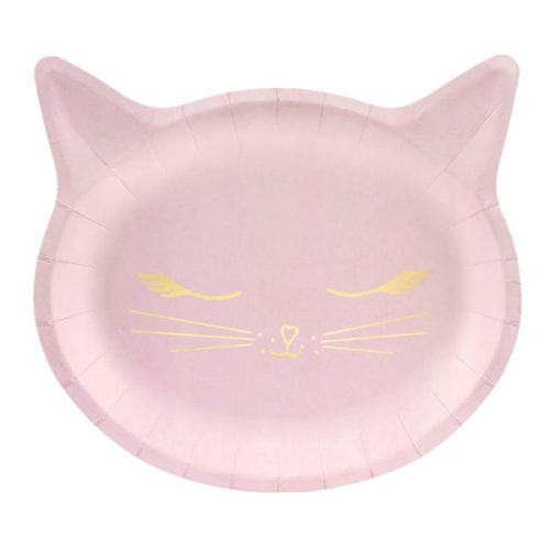 Εντυπωσιάστε τους καλεσμένους σας με έναν πανέμορφο γενέθλιο μπουφέ! Ροζ πιάτα πάρτυ σε σχήμα γλυκιάς γατούλας με χρυσές λεπτομέρειες.