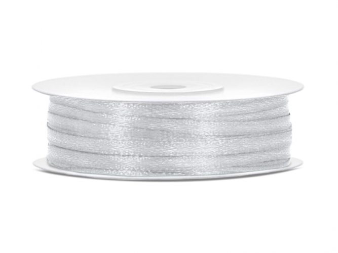 Γυαλιστερή ασημί σατέν κορδέλα για κάθε είδους χειροτεχνία, για συσκευασίες δώρων ή για διακοσμήσεις.
